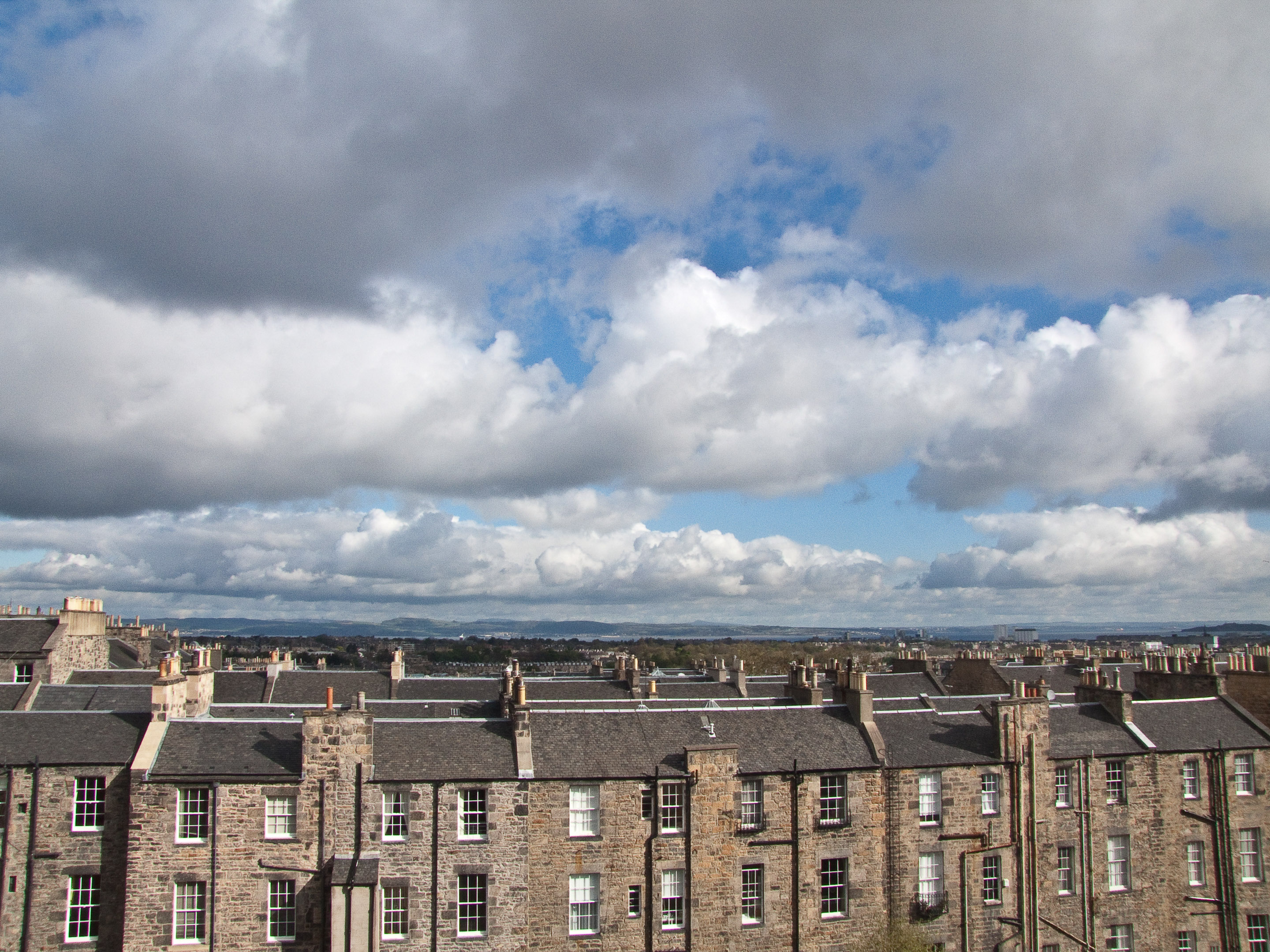 Northeast view from the Royal Scots club of Edinburgh rooftops and the North Sea beyond