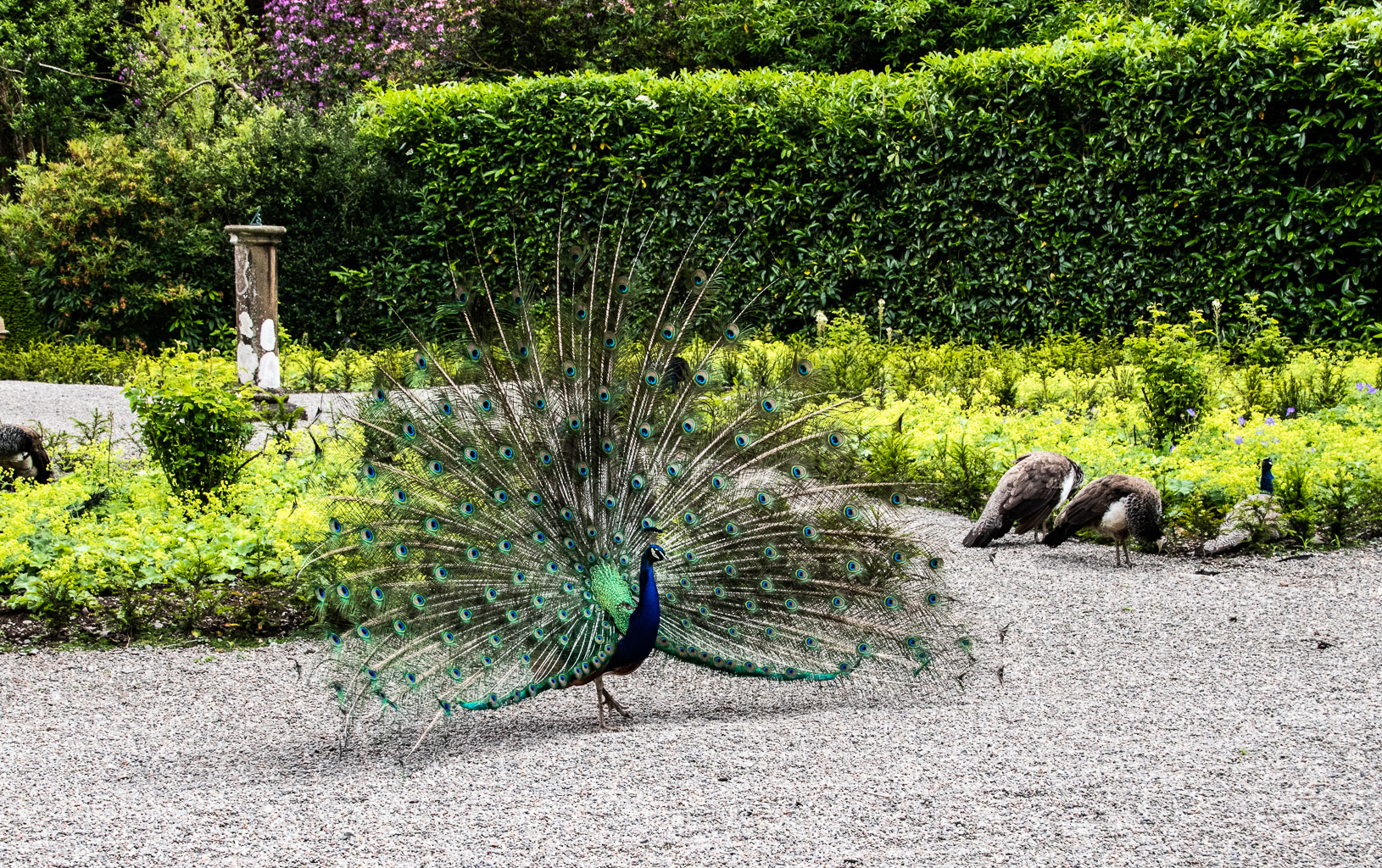 Peacock in front courtyard of Gwydir Castle in Conwy valley, Wales