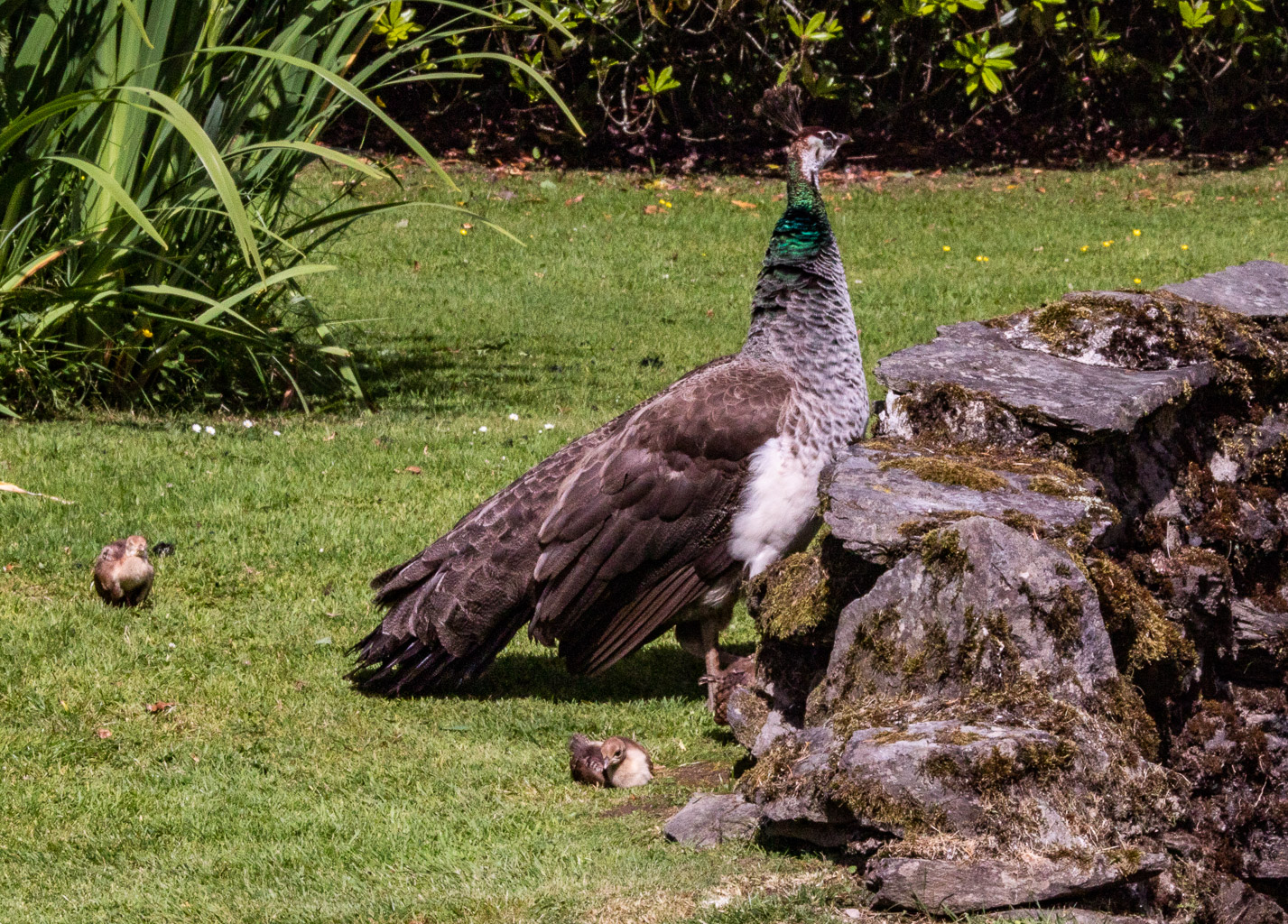Peacock hen with her chicks in garden of Gwydir Castle, Conwy valley, Wales