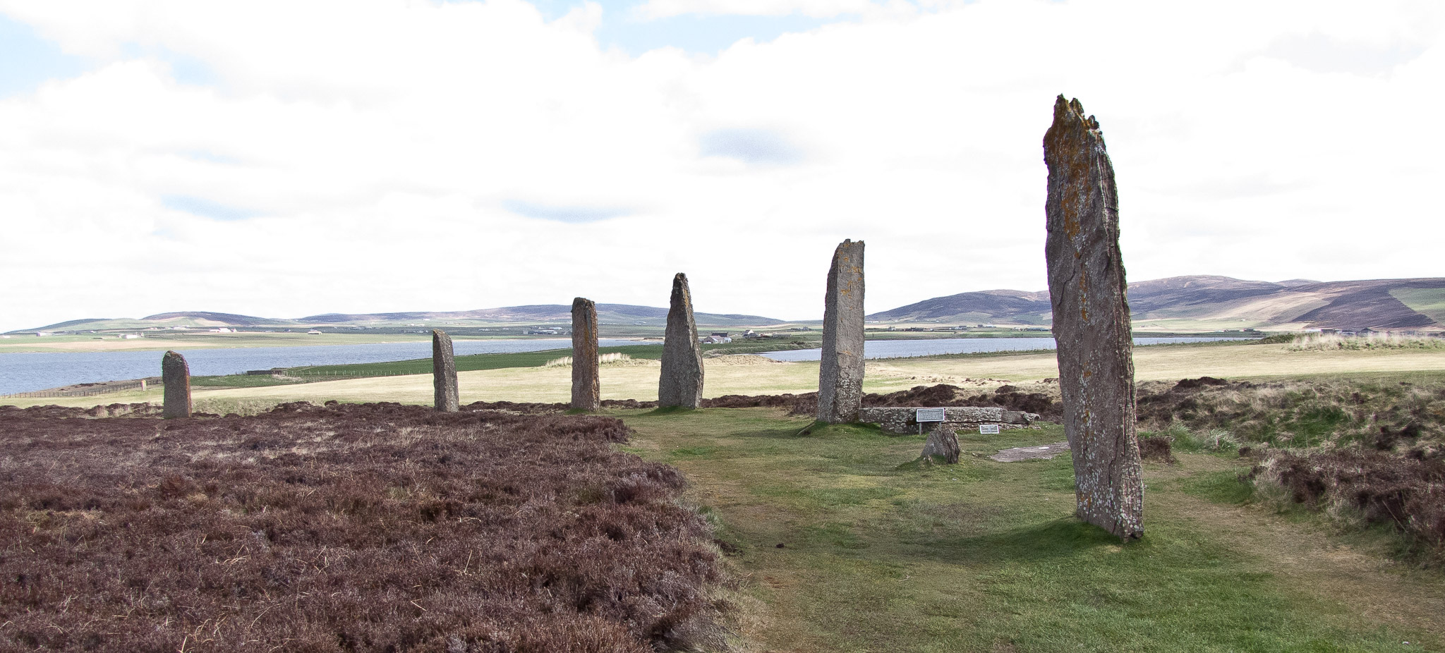Ring o' Brodgar (2500 BC and 2000 BC) is on an eastward-sloping plateau on the Ness o' Brodgar - a thin strip of land in the West Mainland parish of Stenness, Orkney, Scotland.