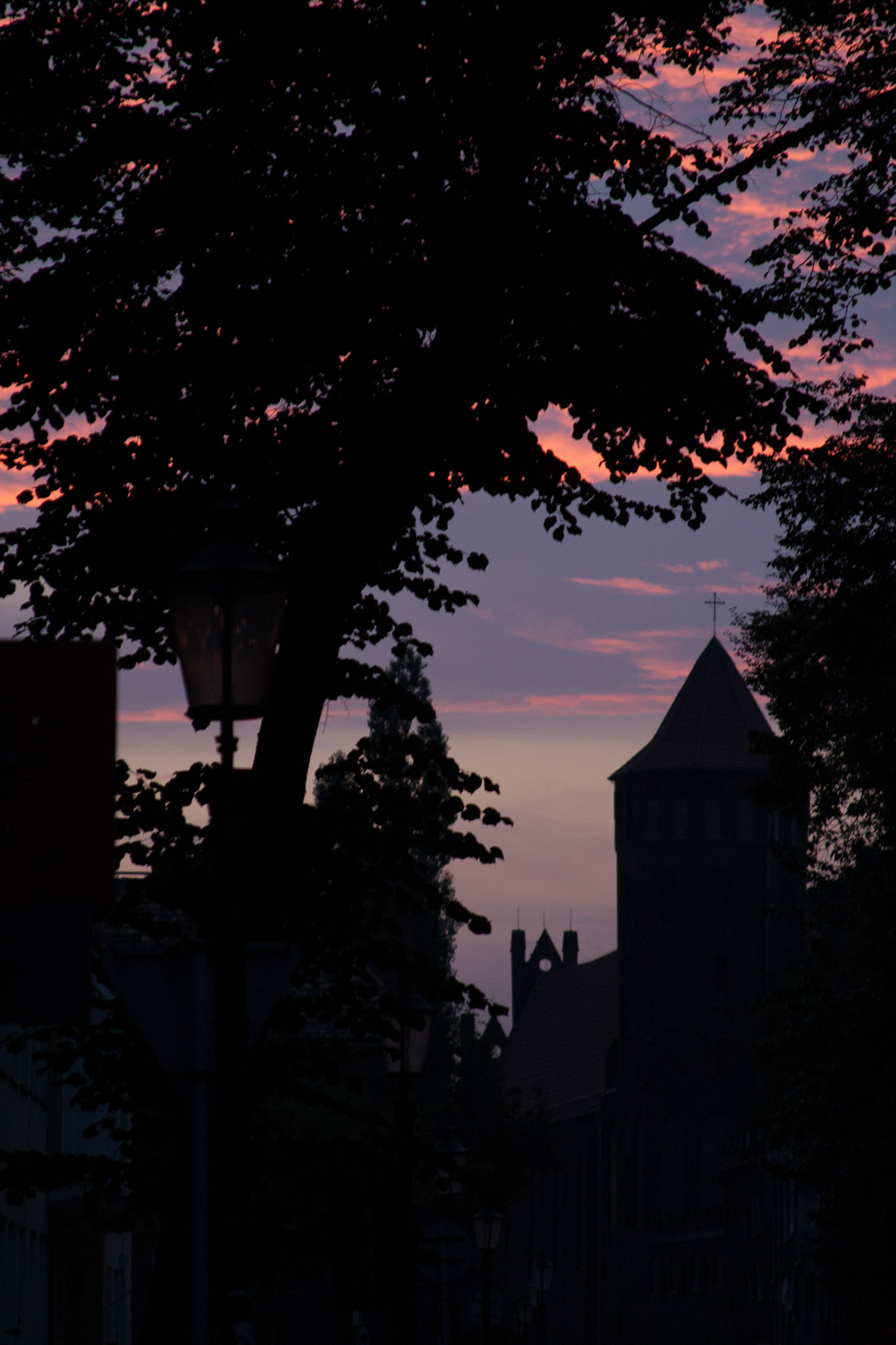 Sunset in Gdansk, Poland, sillhouette of the 14thC Church of St. Nicholas